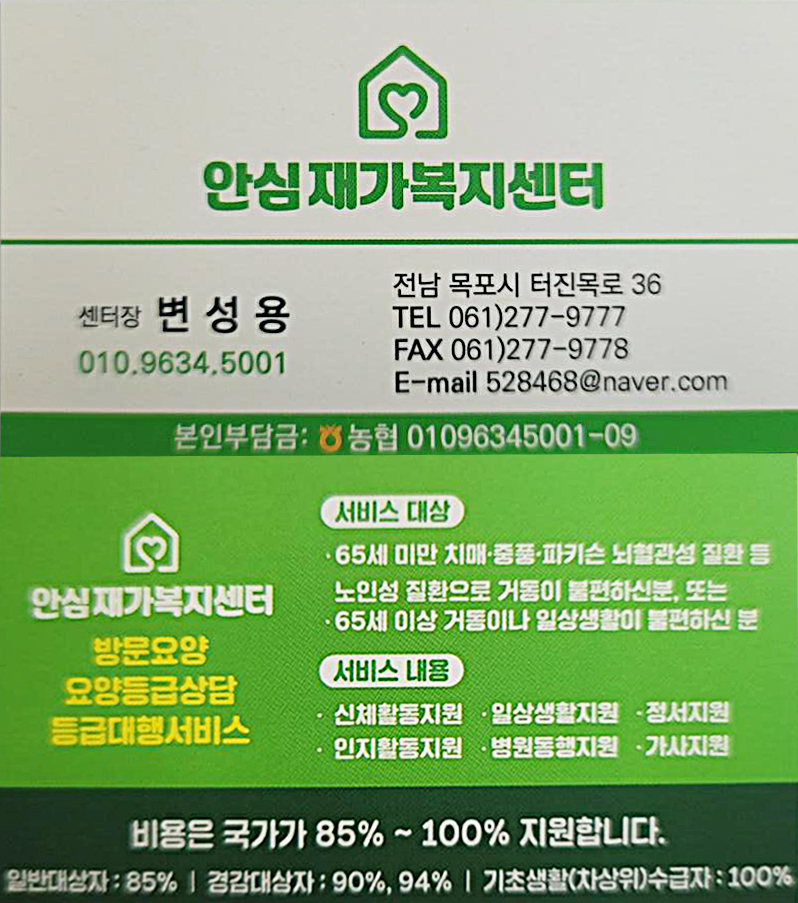 믿을 수 있는 장기 요양 전문 업체를 찾으신다면 안심재가노인복지센터로 연락 주세요!