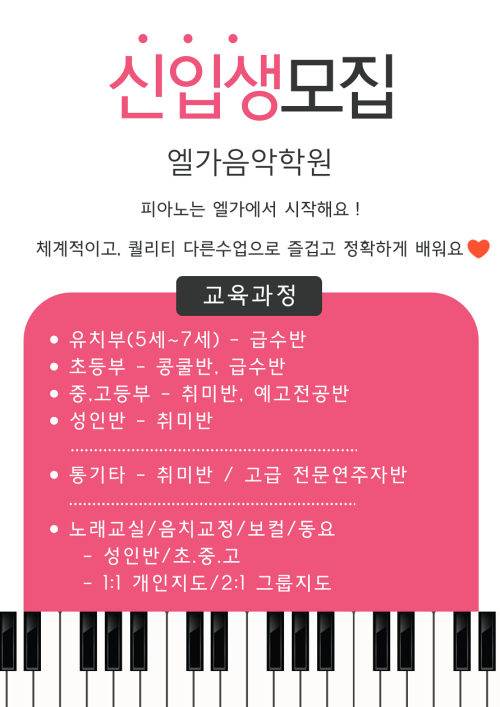 안녕하세요. 저희 엘가는 연령과 학습 목표에 맞춘 음악 교육을 제공하는 피아노 전문학원으로서 기초 리듬부터 실기 능력까지 단계적으로 지도하며 아이부터 성인까지 안정적으로 성장할 수 있는 커리큘럼을 운영하고 있습니다.