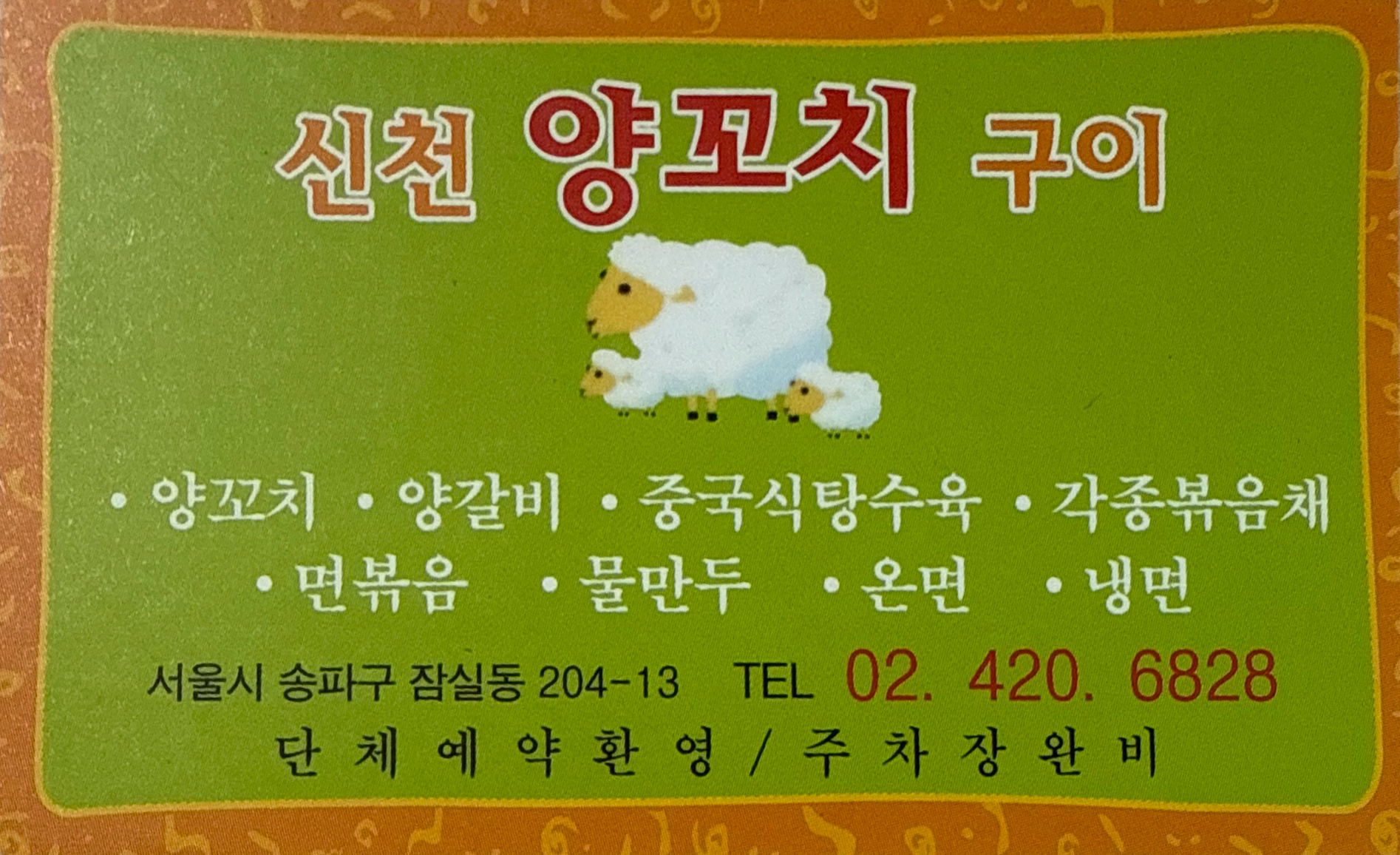 안녕하십니까? 서울 송파구에 위치한 저희 신천양꼬치에는 양꼬치, 꿔바로우 등의 다양한 메뉴가 준비되어 있어 한 끼 식사부터 술안주를 원하시는 손님까지 편안하게 식사하실 수 있습니다.