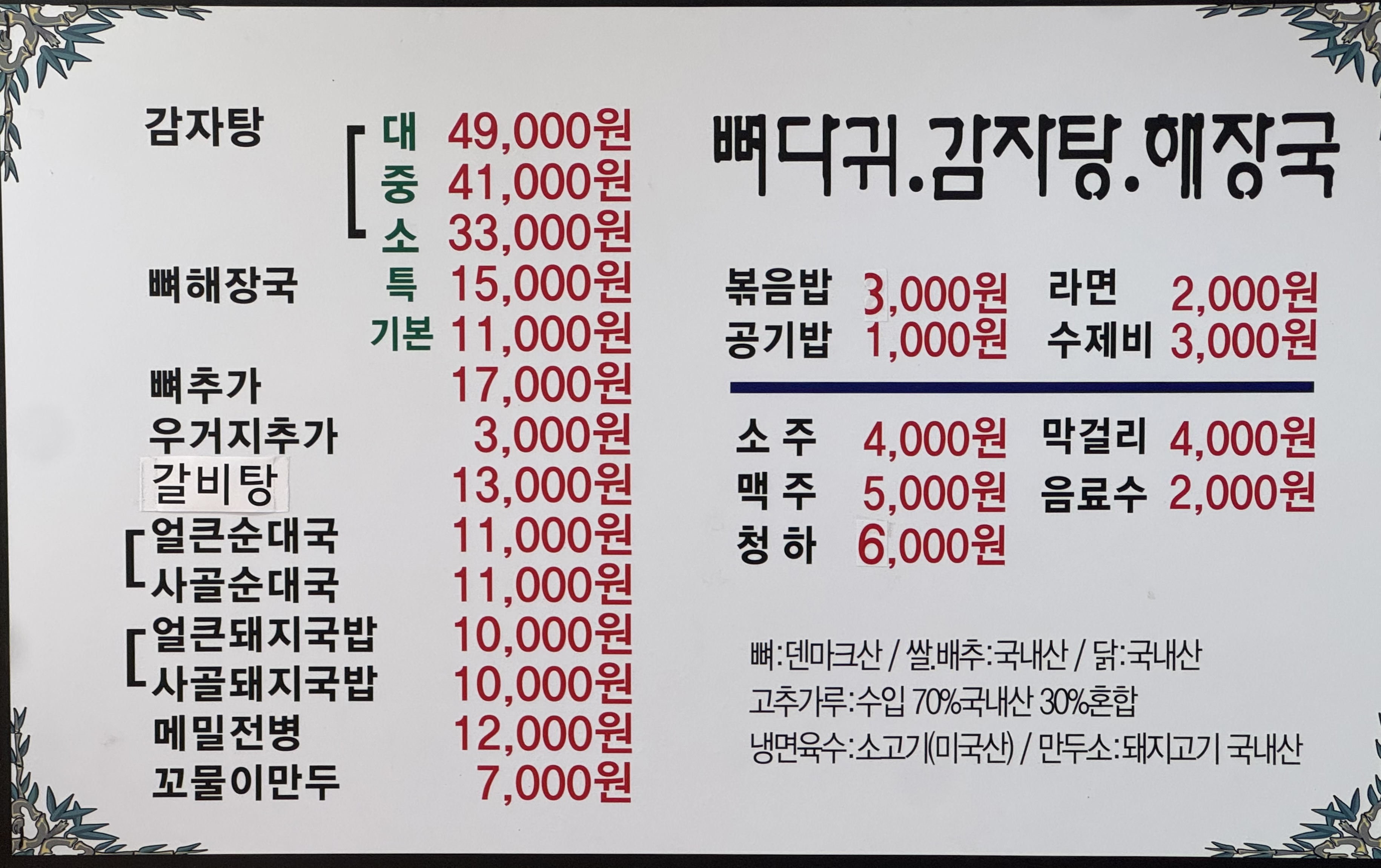 뼈(덴마크산), 쌀(국내산), 배추(국내산), 고춧가루(수입70%, 국내산 30% 혼합), 닭(국내산), 냉면육수(소고기(미국산)), 만두소(돼지고기(국내산))
