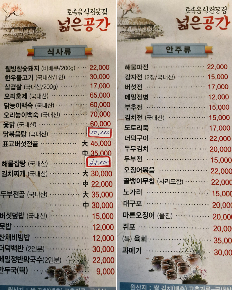 닭(국내산), 한우(국내산), 돼지고기(국내산), 오리훈제(국내산), 오징어(수입산), 쌀(국내산), 배추(국내산), 고춧가루(국내산)