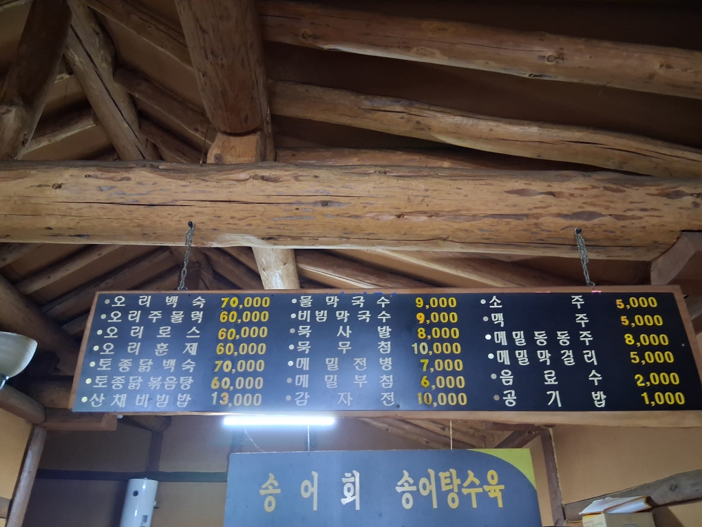 100% 봉평산 메밀만을 사용하여 요리하고 있으며, 송어회, 오리탕, 오리주물럭,