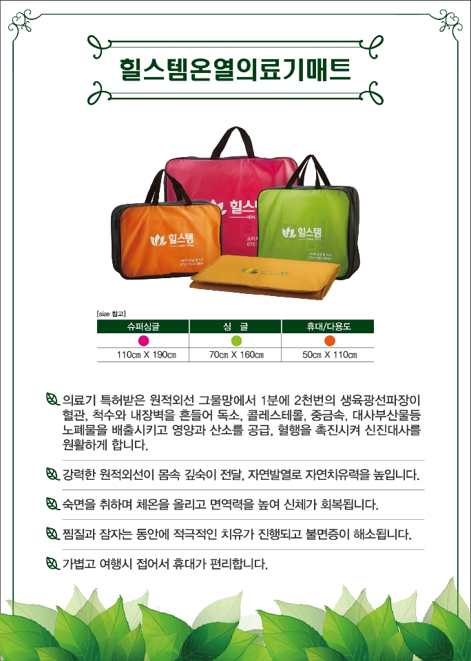 의료기 특허받은 그물망을 사용하여 찜질과 온열의료기매트로 다이어트와 심신의 건강을 회복하는 힐링시스템입니다.