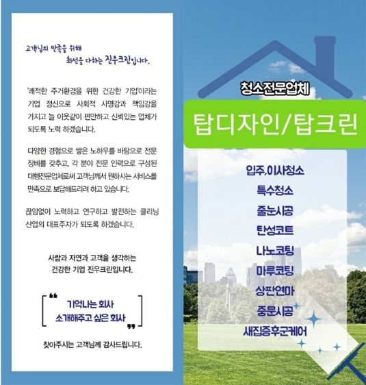 안녕하세요, 저희 탑크린은 정직한 서비스와 책임감 있는 시공으로 고객님께 신뢰를 드리는 입주·이사·준공청소 및 시공 전문 업체입니다.