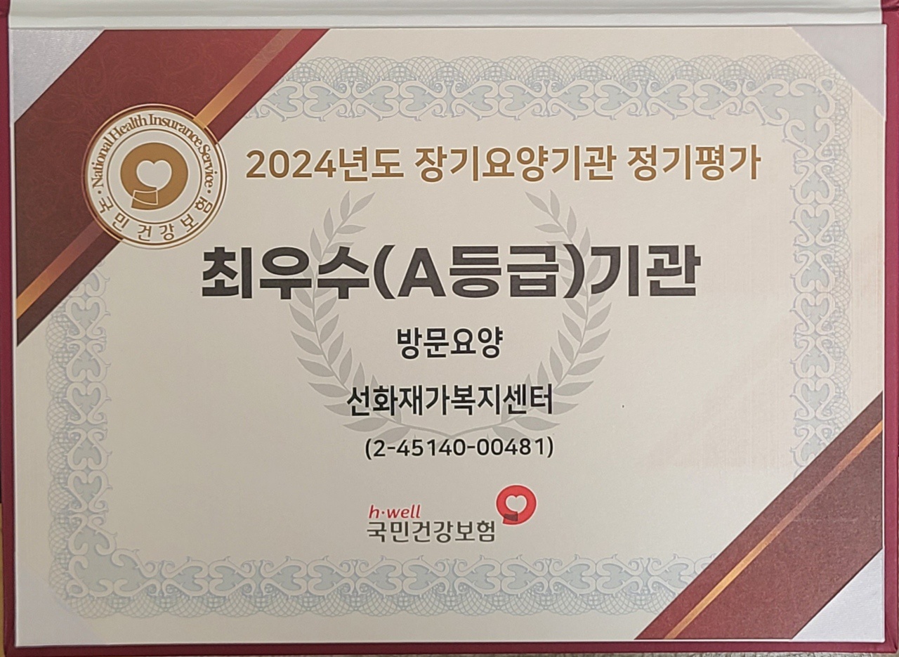 전북 익산시에 위치한 저희 선화재가복지센터는 노인성 질환을 겪고 계신 어르신들의 심신 안정과 부양가족의 부담을 덜어드리고자 각 분야 전문 인력이 맞춤형 서비스를 제공해 드리고 있습니다.