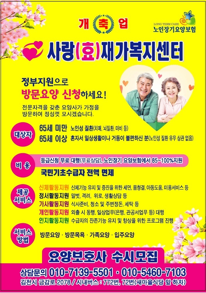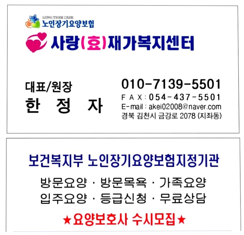 믿을 수 있는 장기 요양 전문 업체를 찾으신다면 사랑효재가복지센터로 연락 주세요!