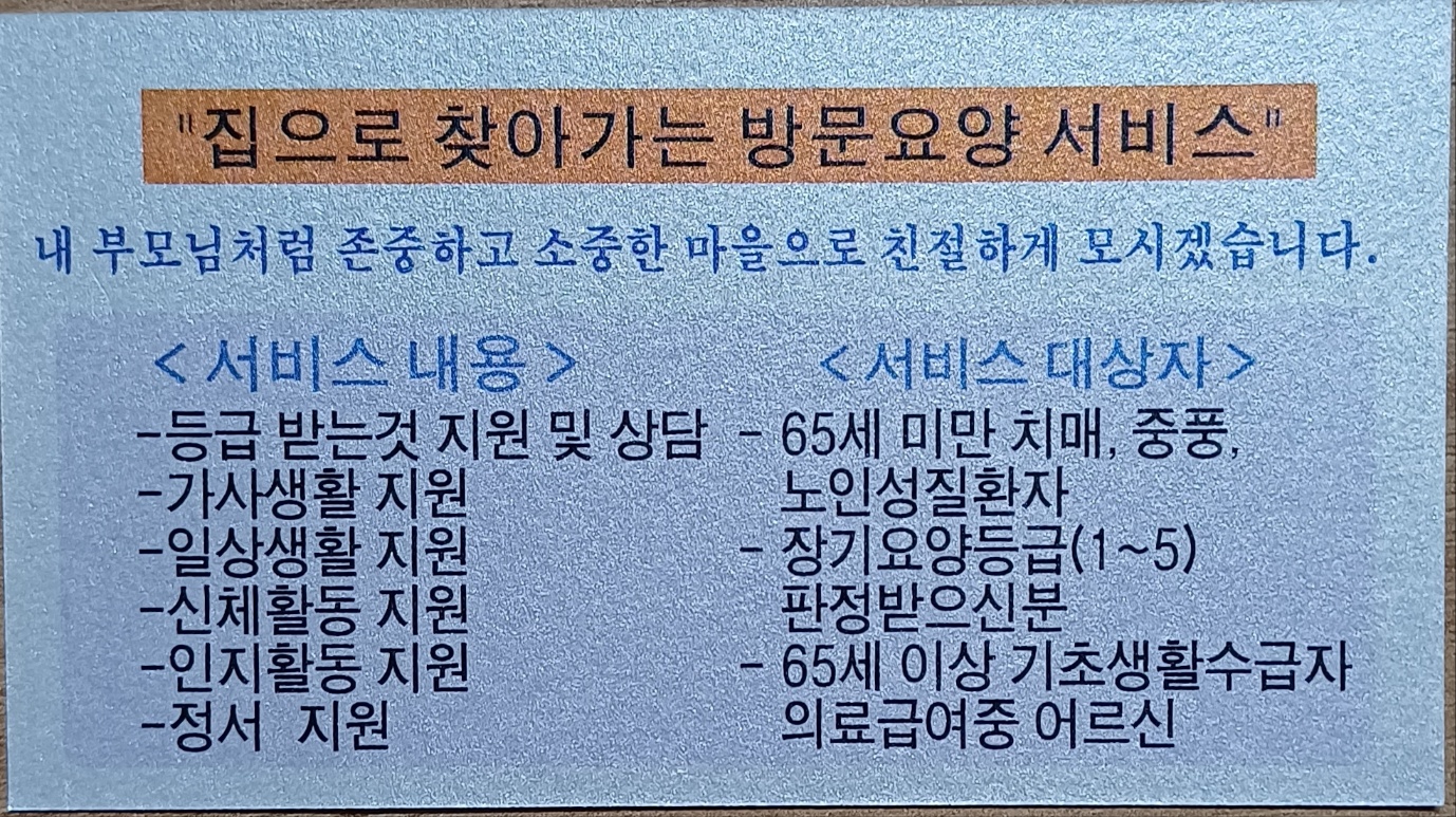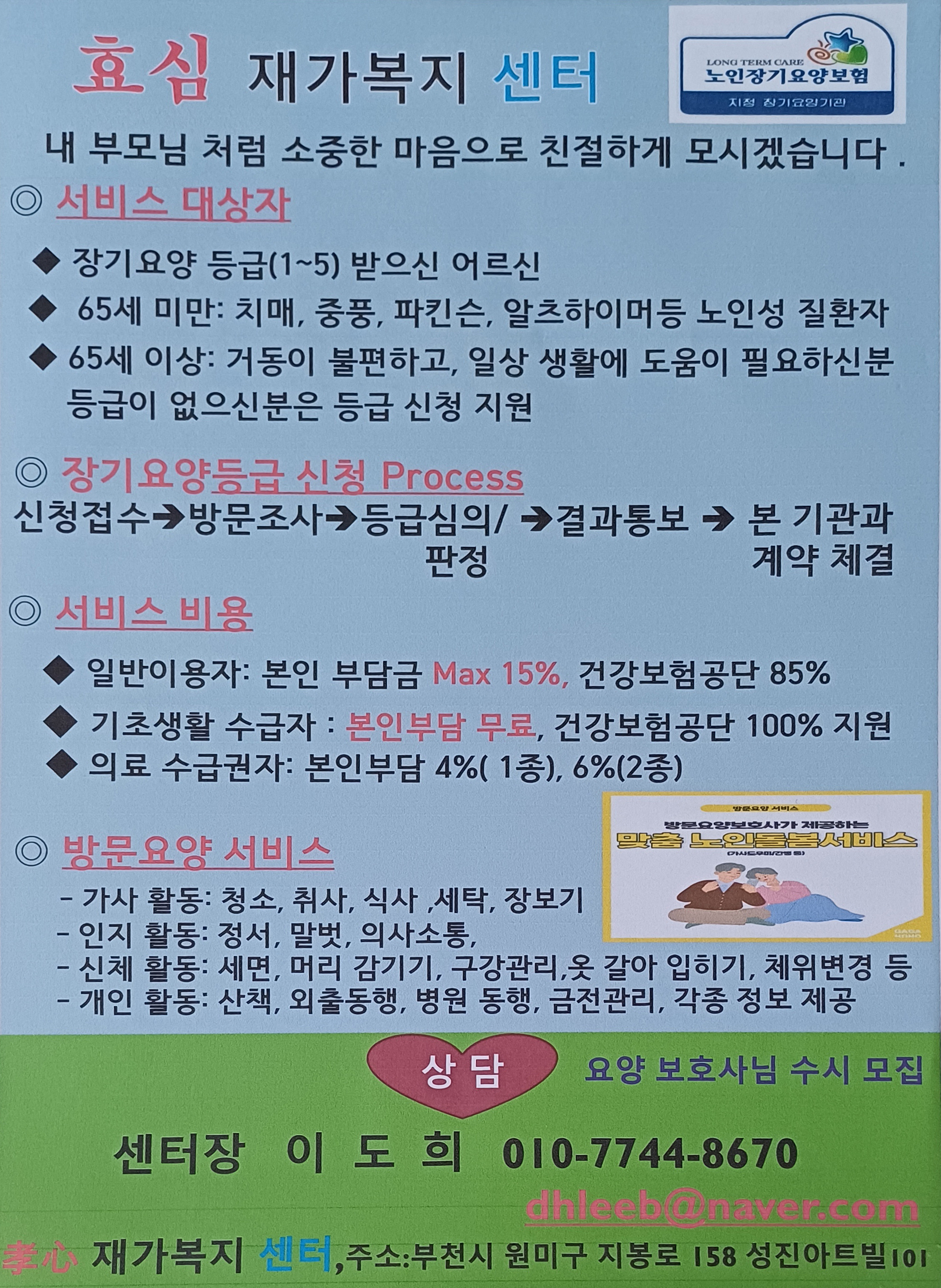 안녕하세요. 저희 효심 재가복지 센터에서는 어르신들께서 살고 계신 댁에서