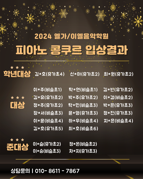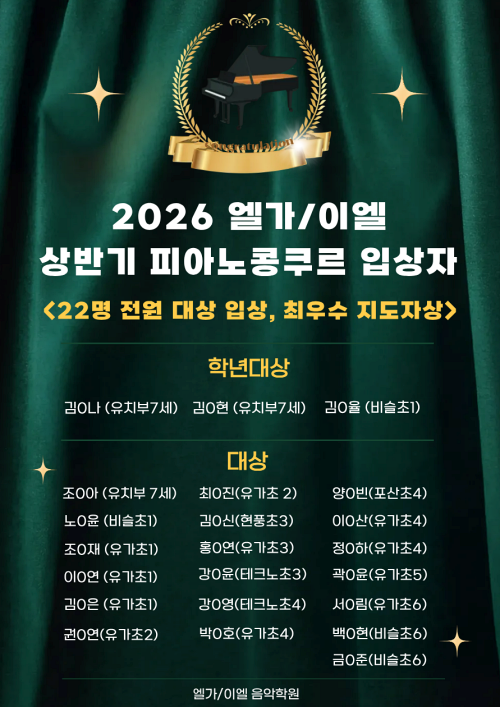 안녕하세요. 저희 엘가는 연령과 학습 목표에 맞춘 음악 교육을 제공하는 피아노 전문학원으로서 기초 리듬부터 실기 능력까지 단계적으로 지도하며 아이부터 성인까지 안정적으로 성장할 수 있는 커리큘럼을 운영하고 있습니다.