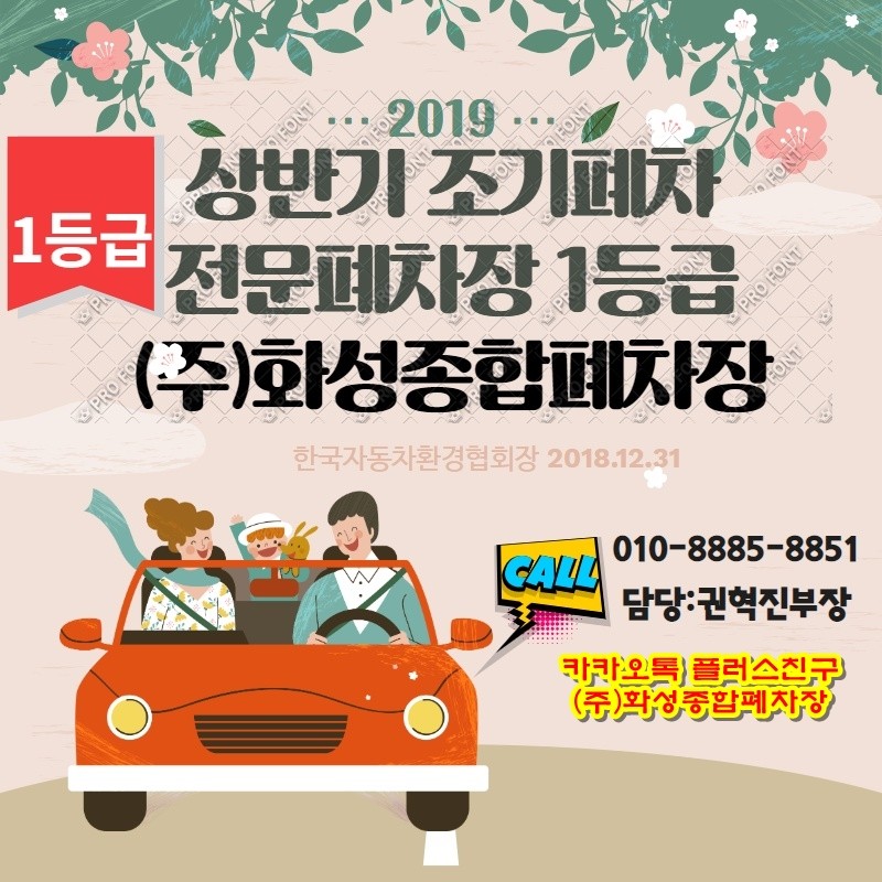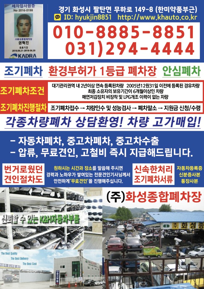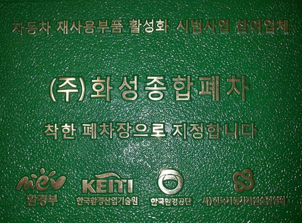 저희 (주)화성종합폐차장은 고객 여러분들의 성원과 격려에 부응코자, 2014년 화성시 소재에 대규모 부품 판매부를 증설/확장하여 새로운 부품 공급 시스템을 갖추고 인터넷쇼핑몰을 오픈 하였으며 고객님들께 부품안내 상담을 통해 소비자의 기호에 맞는 서비스와 A/S 체제를 갖추었습니다. 또한, 환경부 지정 시범사업협약업체로 지정 받아, 중고 부품을 원하시는 고객님들께 양질의 검증된 부품을 지속적으로 공급하게 되었음을 진심으로 감사하게 생각합니다. 고객님께서 원활한 자동차 부품 구입을 하실 수 있도록 매장에 약 2만 여 점의 부품을 비치함과 동시에 차량이 오래되어 공급이 중단된 부품을 구입하시는데 어려움을 해소함으로써 고객님들께 경제적 부담을 줄여드리고 나아가 국가적으로는 자원 부족 해소 및 친환경 개선에 일조하여 상생의 사명감을 잃지 않을 것이며 엄격한 부품 성능 테스트를 실시하여 믿고 구입하실 수 있도록 신뢰 받는 업체가 될 수 있도록 노력하겠습니다.