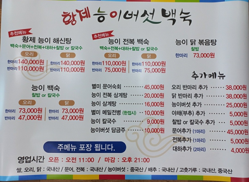 능이 전복 백숙 추천! 백숙+전복+대하+찰밥 or 칼국수 오리 한마리 110,000원 오리 반마리 75,000원 닭 한마리 110,000원 닭 반마리 75,000