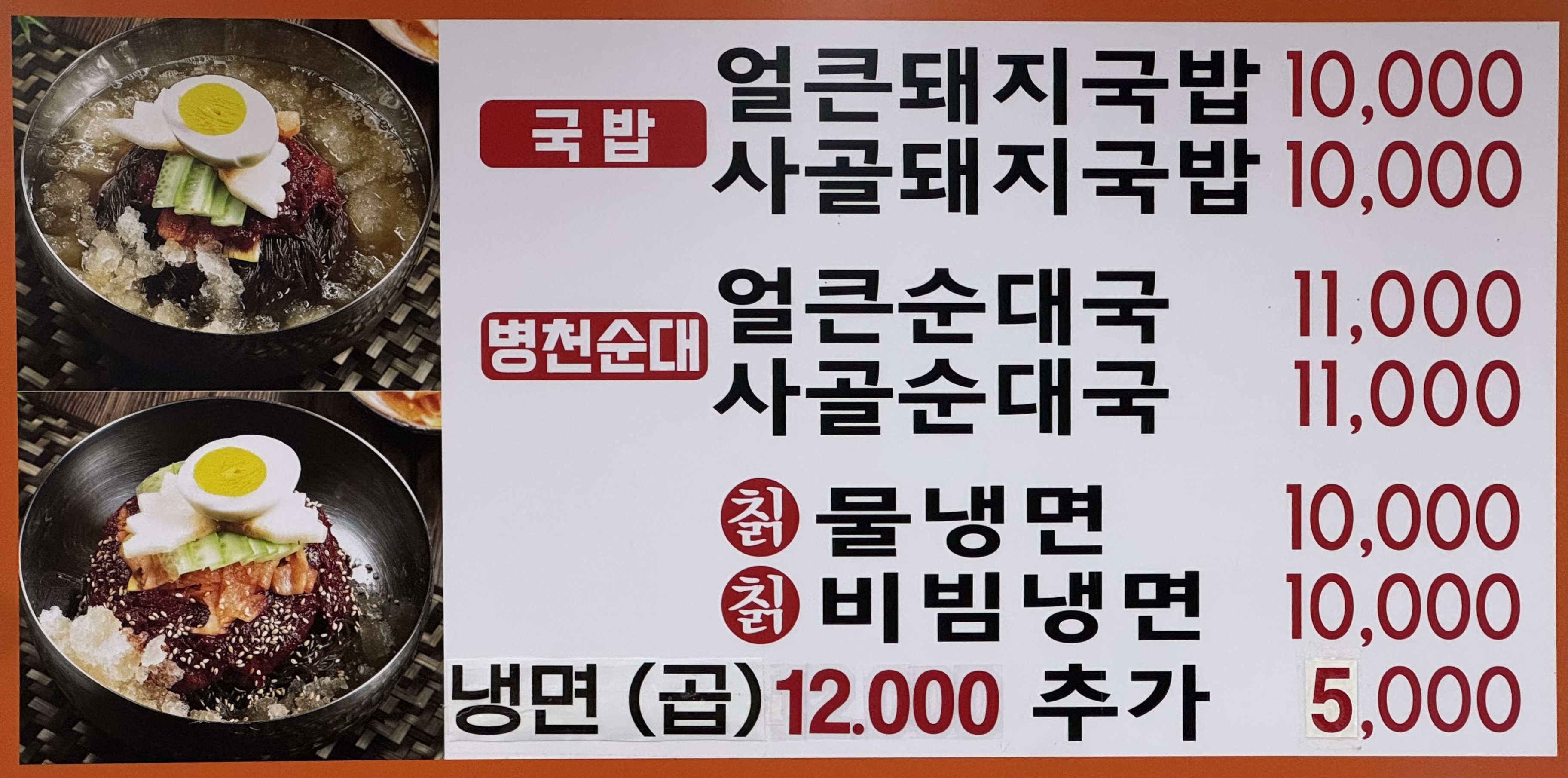 뼈(덴마크산), 쌀(국내산), 배추(국내산), 고춧가루(수입70%, 국내산 30% 혼합), 닭(국내산), 냉면육수(소고기(미국산)), 만두소(돼지고기(국내산))
