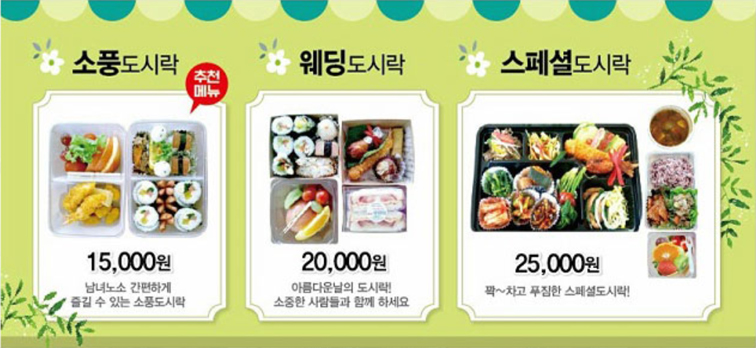 문의 전화 주시면 예약 가능일, 메뉴, 도시락 콘셉트, 가격 등