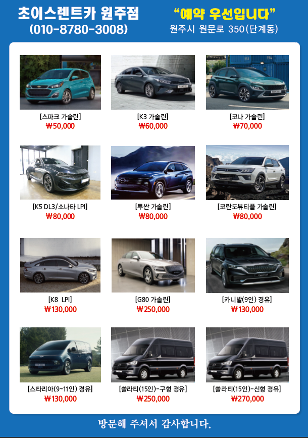 승용차 7일전 취소시 100%환불/ 승합,쏠라티차량 30일 전 100%환불