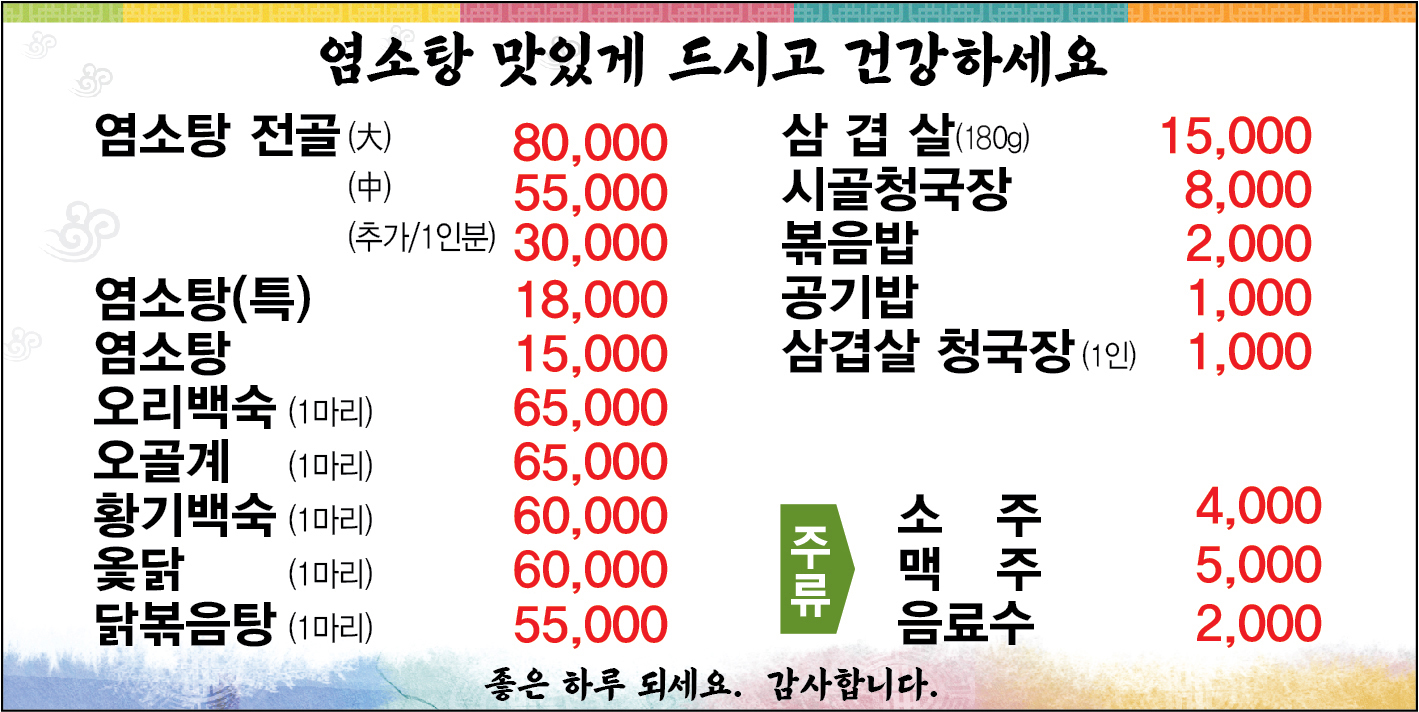 염소탕, 염소전골, 백숙, 오골계, 닭볶음탕, 삼겹살 등의 다양한 메뉴가 준비되어 있으며