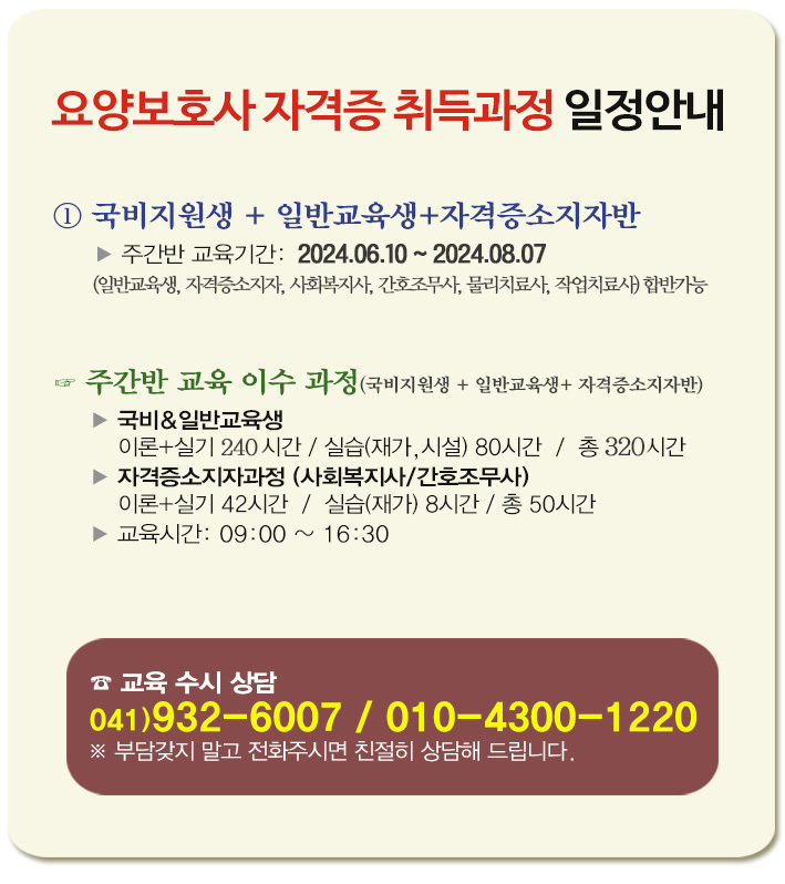 직업윤리, 노인심리, 응급대처법 등 필수 교육과정을 지도함으로서 요양보호사 자격을 갖추도록