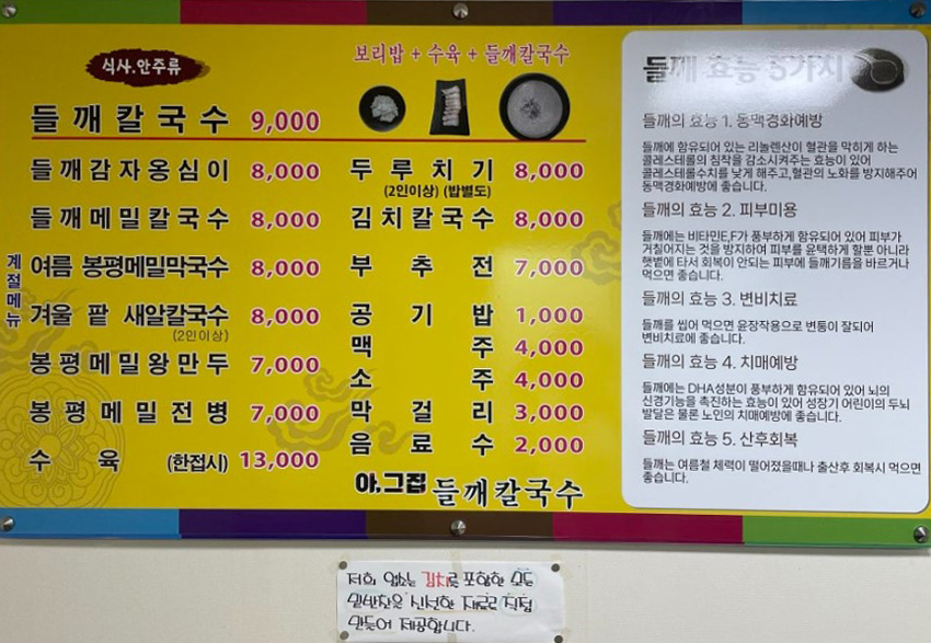 보리밥+수육+들깨칼국수, 들깨감자옹심이 등의 푸짐한 메뉴가 준비되어 있으며,