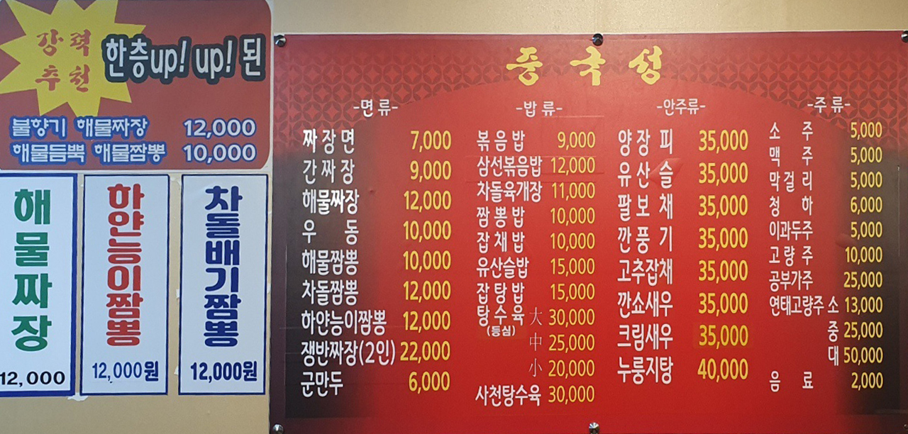 짜장면, 간짜장, 짬뽕, 능이짬뽕, 해물짬뽕, 차돌짬뽕, 우동