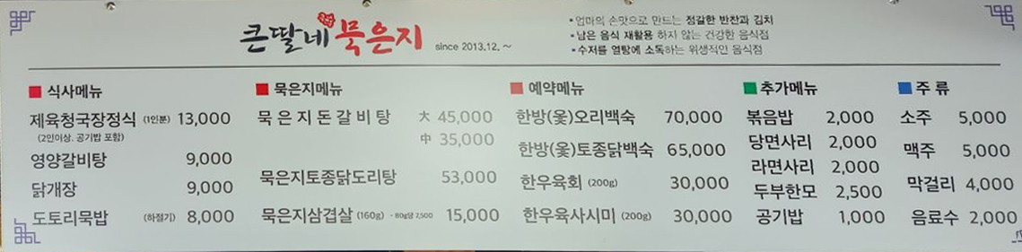 묵은지돈갈비탕, 묵은지토종닭볶음탕, 묵은지삼겹살, 제육청국장정식, 도토리묵밥, 영양갈비탕, 닭개장 등