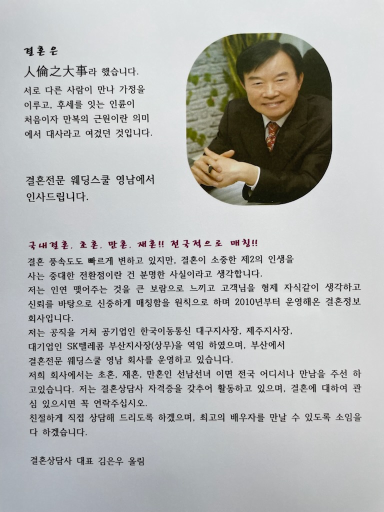 저희 결혼전문웨딩스쿨영남은 외적 조건만이 아닌 다각적인 조건을 분석하여 적합한 인연을 맺어드리고자 세심한 노력을 다하고 있습니다.
