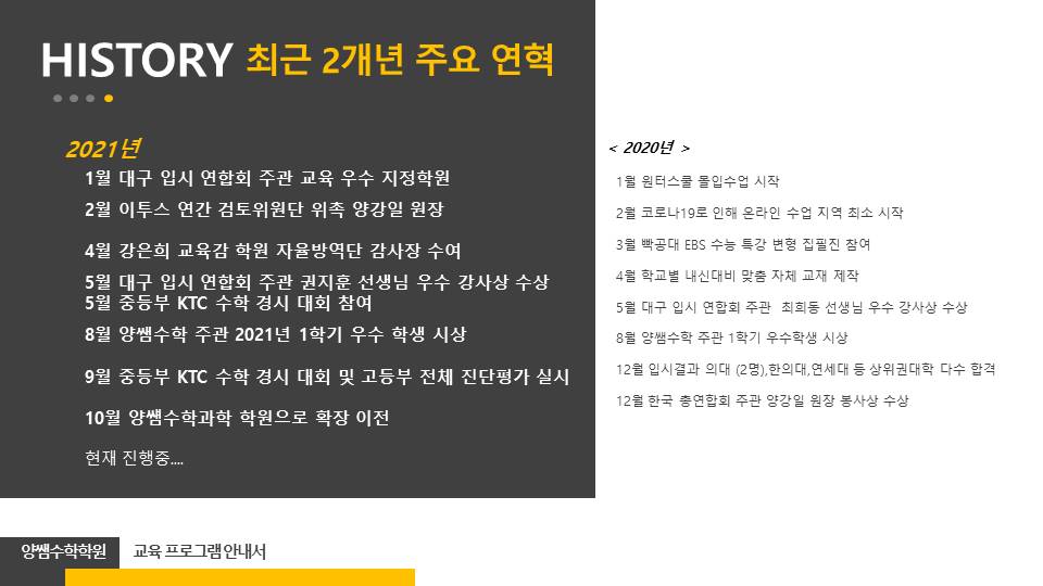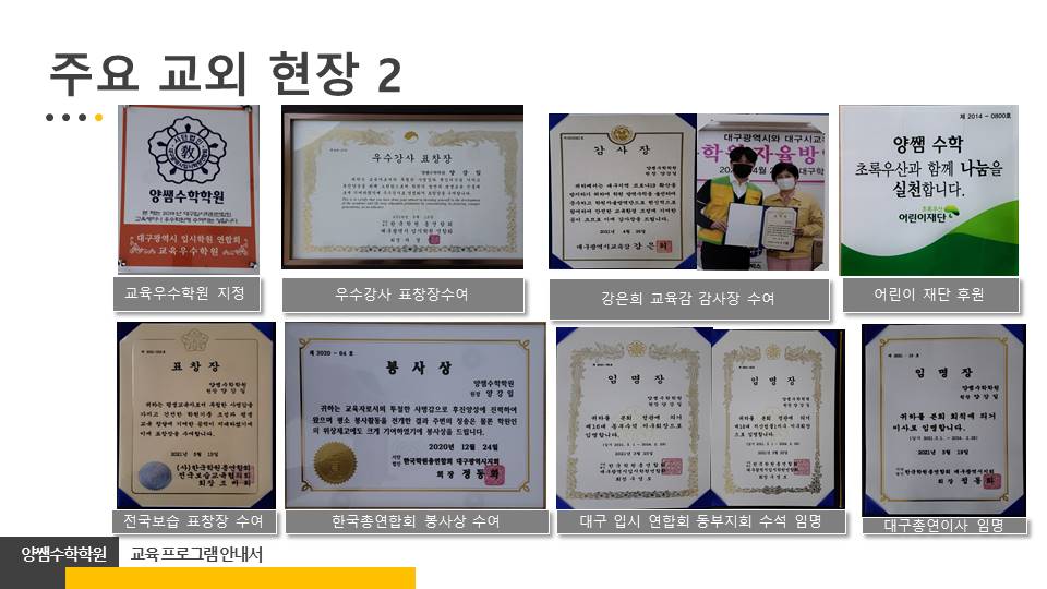 지난 10년간 양쌤수학과학학원을 이끌고 있는 원장 양강일입니다. 자녀를 믿고 맡겨 주신 학부모님들의 관심과 성원 덕분에 이렇게 오랜 시간 동안 꾸준히 저희 학원이 성장할 수 있었습니다.