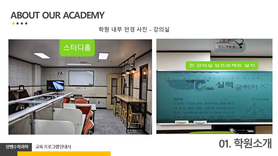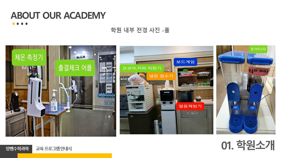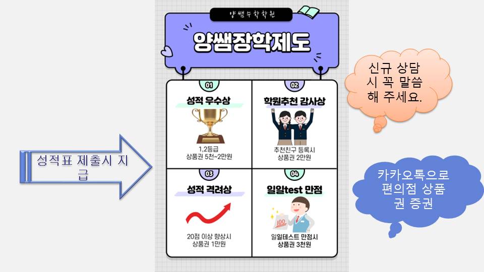 저희 학원을 통해 학생의 미래가 조금이라도 긍정적으로 바뀔 수 있다면 이 것만으로도 큰 기쁨입니다. 자녀의 공부에 걱정을 덜어드리고, 원하는 목표를 성취할 수 있도록 노력하는 학원이 되겠습니다. 감사합니다.