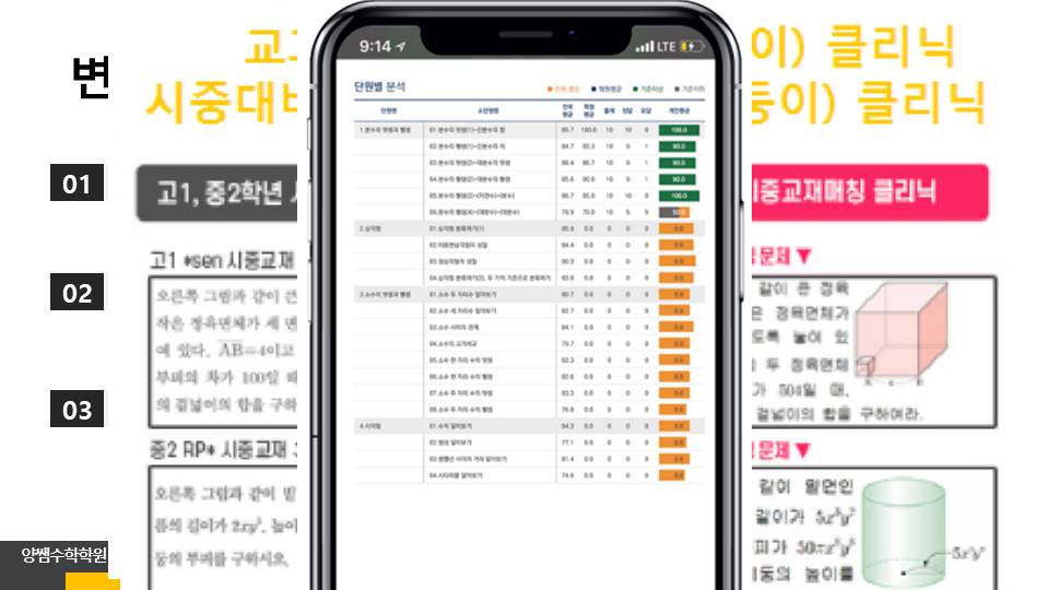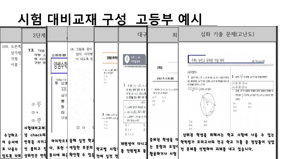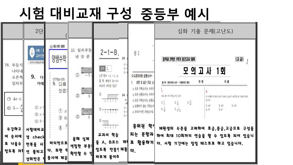 저희 원은 오랜기간 동안 누적된 수성구 내 학교 출제 경향 및 학사 일정을 파악하여, 학교별 그리고 실력별 맞춤 내신 대비 교재를 자체 제작 하고 있으며, 매 학기마다 높은 적중률을 보이고 있습니다.