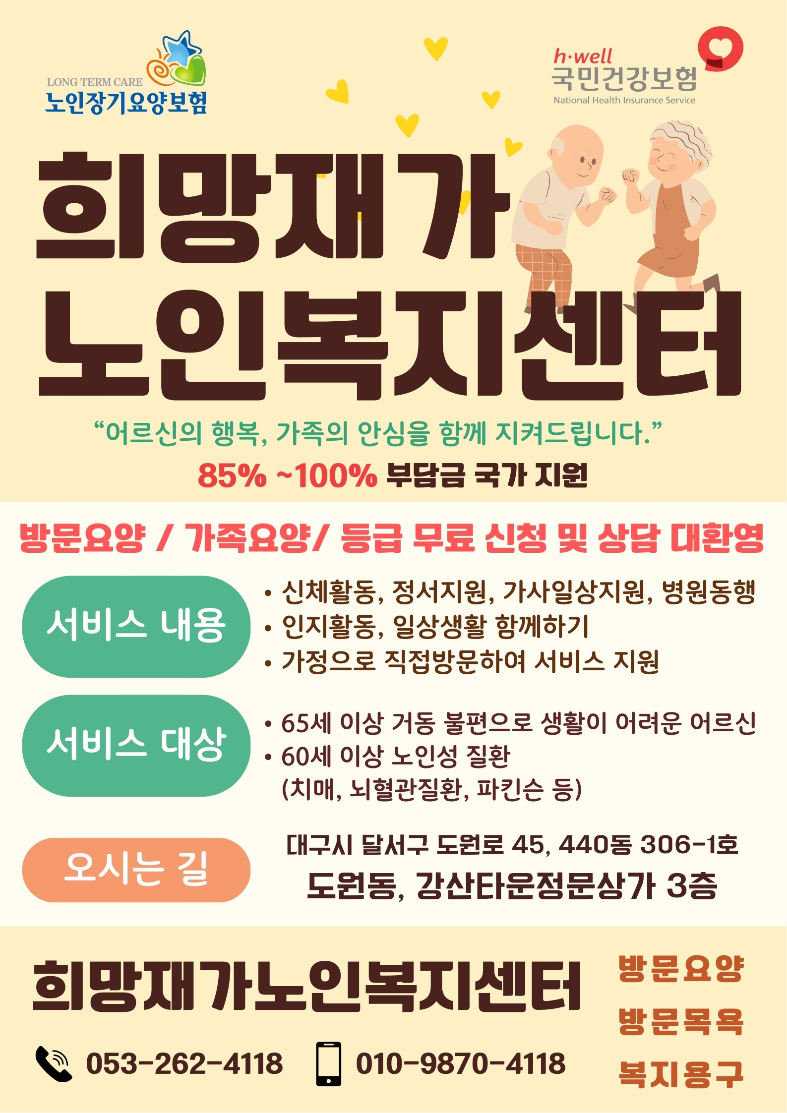 앞으로도 가족의 부담은 덜고, 어르신의 행복은 더하는 믿음직한 동행이 되겠습니다.