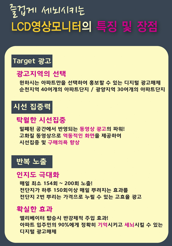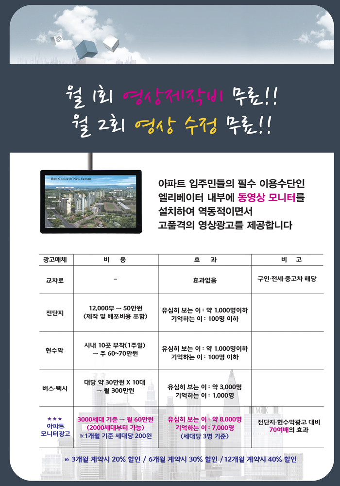 17초 영상을 무료로 제작!매일 140회에서 200회까지 송출!매월 1회 영상 변경 무료!매월 1회 아파트 변경 가능!(적은 비용으로 많은 아파트에 홍보할 수 있음)