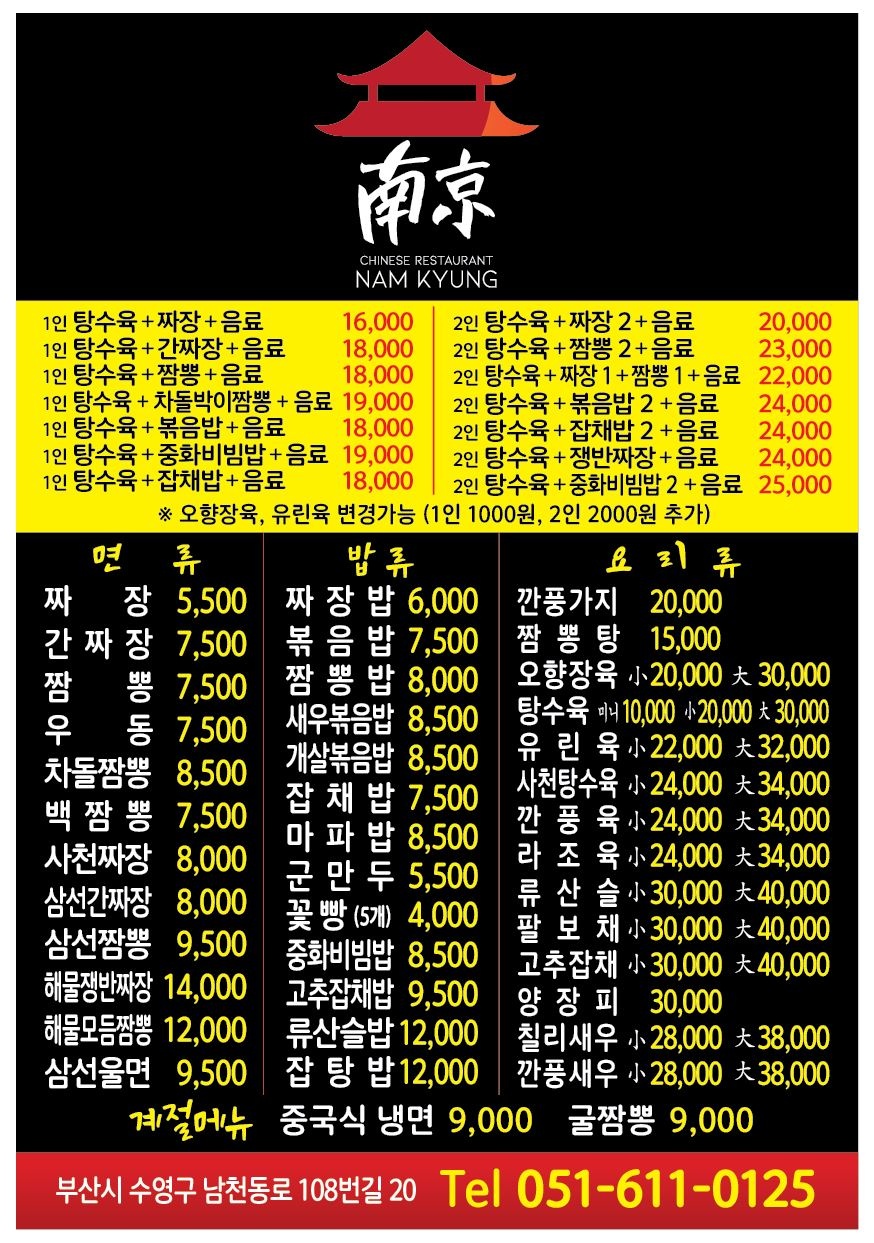 안녕하세요. 부산 수영구에 위치한 저희 "남경"은 중화요리 전문점으로